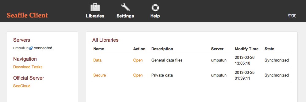 В принципе, после установки сервера вы уже вполне можете это использовать. Единственный способ работы с компьютера будет через web интерфейс. Способ вполне рабочий, особенно если надо что-то быстро посмотреть или загрузить. Кстати, интерфейс хотя и очень лаконичный, но вполне функционалый. Все то, что вы ожидаете тут будет работать. К файлам тех форматов, что можно показать, будет показываться превью, загрузка/выгрузка доступна как отдельных файлов, так и каталогов и даже целых библиотек. Библиотеки это в seafile такие разделы. Переводя на язык Dropbox – каждая библиотека это свой отдельный dropbox к которому не нужен дополнительный экаунт.