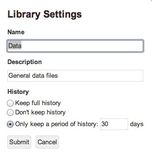 Seafile поддерживает историю/версионность. В отличии от Dropbox, степень и глубина этой истории может регулироваться на уровне библиотеки и позволяет задать то, что вам удобно. На практике это весьма полезная возможность и позволяет достаточно гибко управлять размером таких исторических версий в зависимости от вашей ситуации, размера диска на сервере и степенью паранойи. Кстати, при желании можно ограничить и максимальный размер того, что пользователь займет на диске. Насколько я понимаю, это работает на уровне пользователя а не конкретной библиотеки.