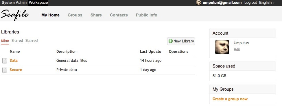 И да, эта штука поддерживает многих пользователей, т.е. нечто вроде dropbox для рабочих групп. В Seafile есть возможность управлять пользователями, объединять их в группы, делиться файлами в группах и даже обмениваться некими сообщениями. Я об этом мало что могу сказать, т.к. в моем случае есть только один user и никакая компания мне тут пока не нужна. Однако, судя по обсуждениям в их форуме, подобное использование черезвычайно популярно в мелких и даже крупных группах и организациях.