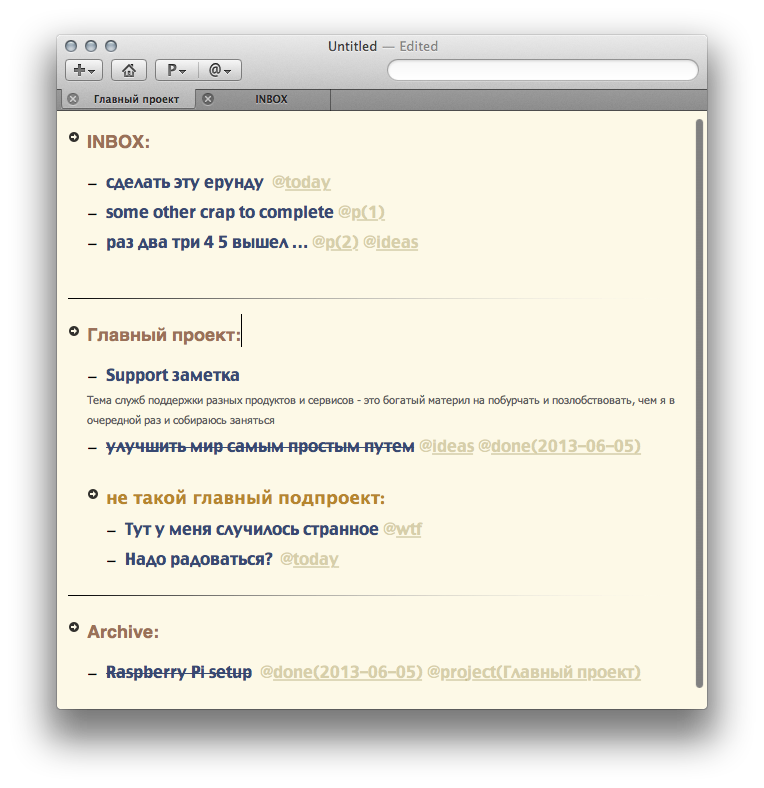 Как ни странно, особого выбора у меня по сути и не было. Я честно проверил все варианты до которых мог дотянутся, ну точно не менее десятка. Еще примерно столько-же попытался оценить с чужих слов или по демо и документации. Если вы в комментариях скажете “а почему не взять NNN”, то с большой степенью вероятности этот NNN я уже пробовал и отклонил. И из всего многообразия подобных штук, только TaskPaper оказался близок к тому, что мне хочется. И даже он не “вау, это оно!”, но ближе всего к цели.