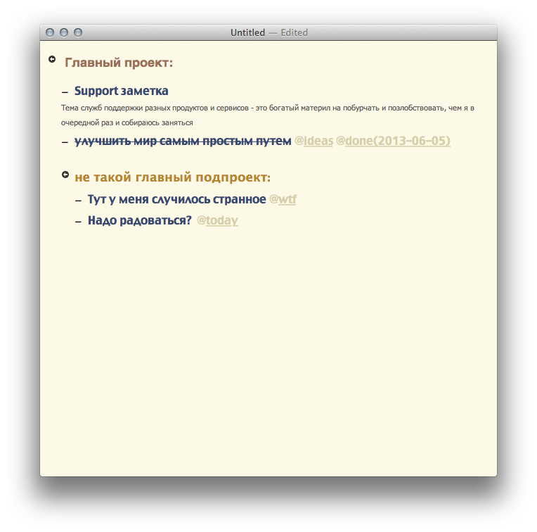 В заключение скажу, что есть в этом TaskPaper какая-то изюминка, нечто правильное, истинное и посконно-домотканное. Не уверен, что это можно как-то доказать, но мне она кажется чем-то очень подходящим. Очень возможно, что кому-то Тhings или Wunderlist ближе лягут к сердцу, но мой выбор это TaskPaper – простота, которая лучше воровства (прямо рекламный слоган для TP придумался ;)