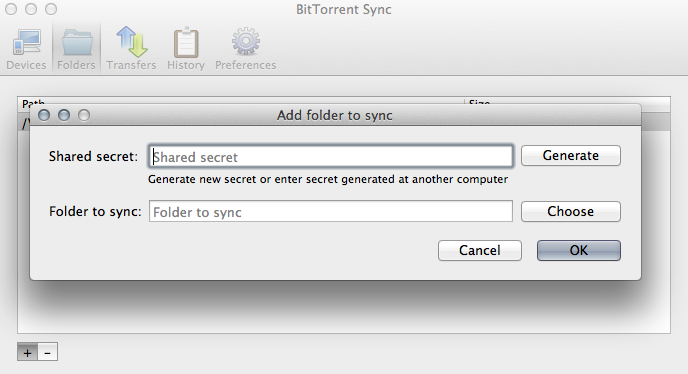 Установка BitTorrent Sync элементарна под любой системой, как впрочем и настройка. Для OSX и Win версий есть простой, но достаточный GUI и минимальная, по типу dropbox, индикация активности. Для прочих версий есть пристойный и полностью функциональный web-ui. Любой каталог в любом месте вашего диска можно добавить в btsync в пару кликов и назначить этому каталогу “Shared secret” (можно ввести руками либо сгенерировать автоматически). Этот shared secret является уникальным ключем к вашему каталогу без знания которого синхронизация невозможна. Все, что btsync передает/принимает защищено этим ключем и AES 256bit шифрованием. Тут наверняка возникнет вопрос о том, насколько надежна подобного рода защита. Действительно, вместо привычного имени и пароля тут вроде только пароль. Кроме того, никаких следов 2х факторной авторизации тут тоже нет, но не смотря на это, степень защищенности велика и случайно или намеренно подобрать ваш Shared secret практически невозможно. На форуме btsync этот вопрос поднимался многократно и может почитать детали тут, или тут или там.