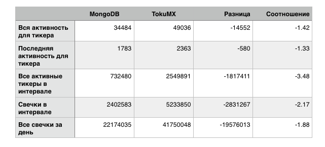 Чтение тестировалось в режиме близком к реальному использованию. Все быстрые запросы (по тикеру) проводились многократно для случайной выборки из 200 тикеров, всего 10000 запросов, результат усреднялся. Интервальные (по времени) запросы проводились для 10-ти случайных интервалов и тоже многократно. В монгу и току посылались одни и те же запросы в одинаковом порядке. Основная цель этого теста была создать активность, максимально близкую к реальной. Время приведено в микросекундах.