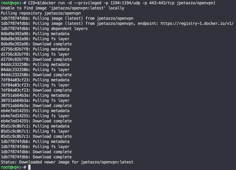 CID=$(docker run -d --restart=always --privileged -p 1194:1194/udp -p 443:443/tcp umputun/dockvpn)