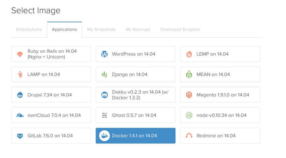 В секции “Select Image” переходим в “Applications” и там выбираем “Docker 1.4.1 on Ubuntu”
