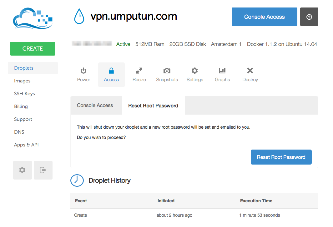 Первым делом надо зайти в консоль вновь созданного дроплета. Это звучит страшно, но на самом деле все очень просто. К этому моменту вам на почту уже должен добраться email с паролем. Если по какой-то причине он не пришел, то в списке Droplets находим наш свеже-созданный, выбираем Access и просим “Reset Root Password”.
