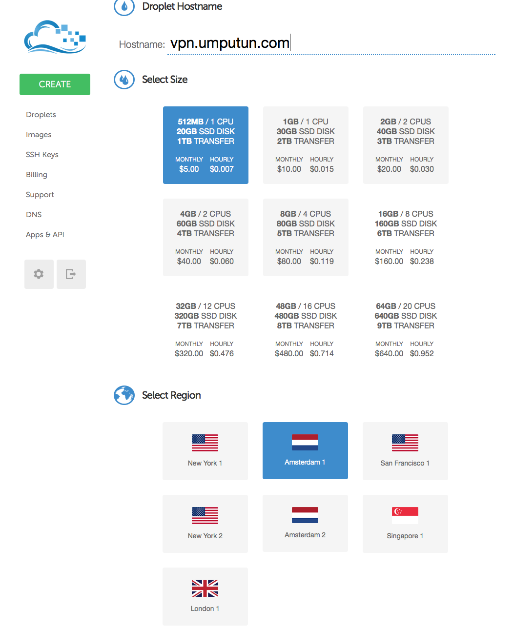 Далее запускаем новый дроплет кликнув на зеленый “CREATE”. Даем ему какое-нибудь имя (любое) на ваш вкус. Я, например, дал своему “vpn.umputun.com”. Выбираем (в “Select Size”) 512MB/1CPU, а в “Select Region” то место, где вы хотите расположить свой VPN. Если вас не волнует доступ к ресурсам которые работают только из США, то разумнее всего выбирать регион близкий к вам (Amsterdam или London для жителей бывшего СССР).