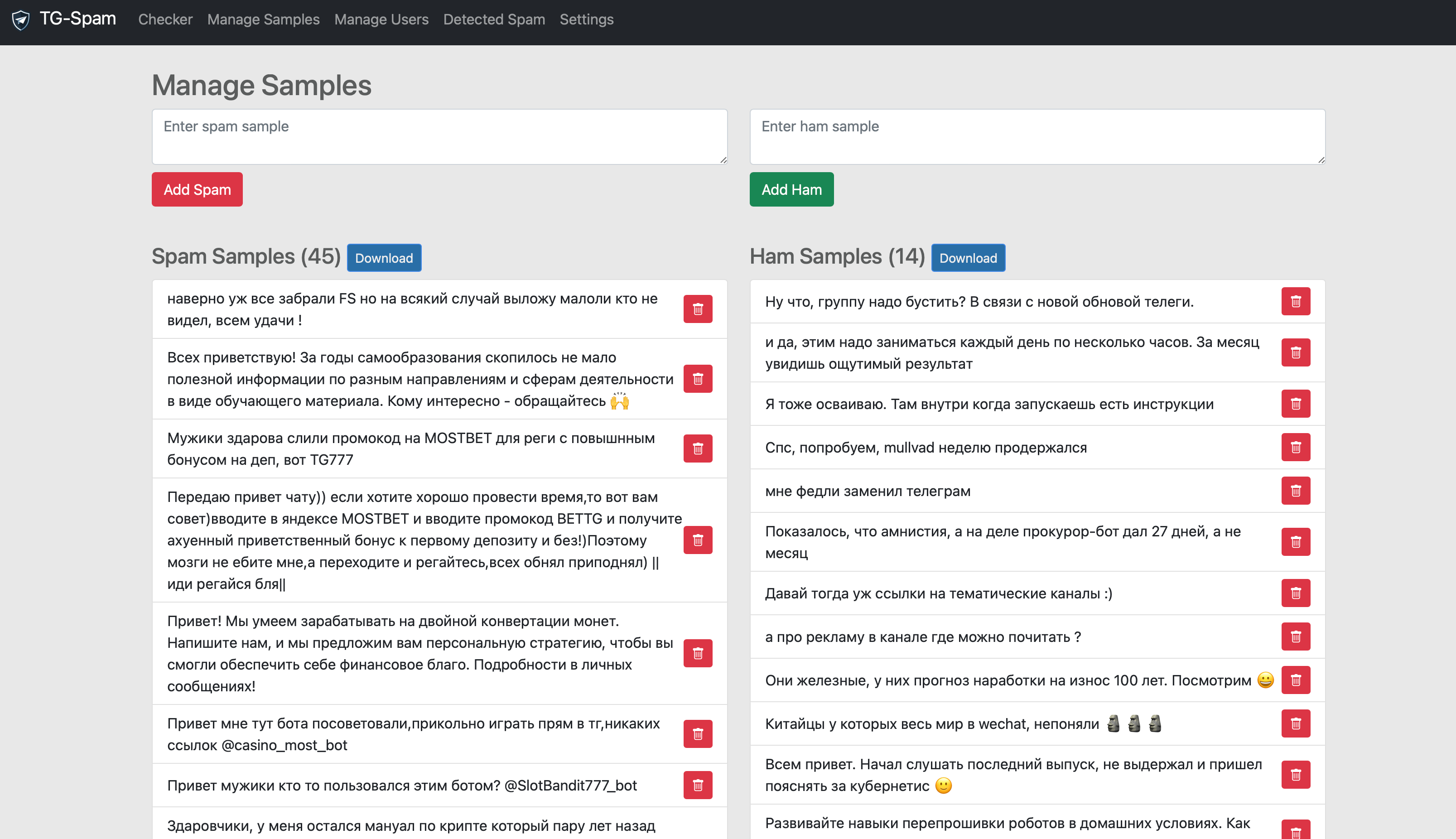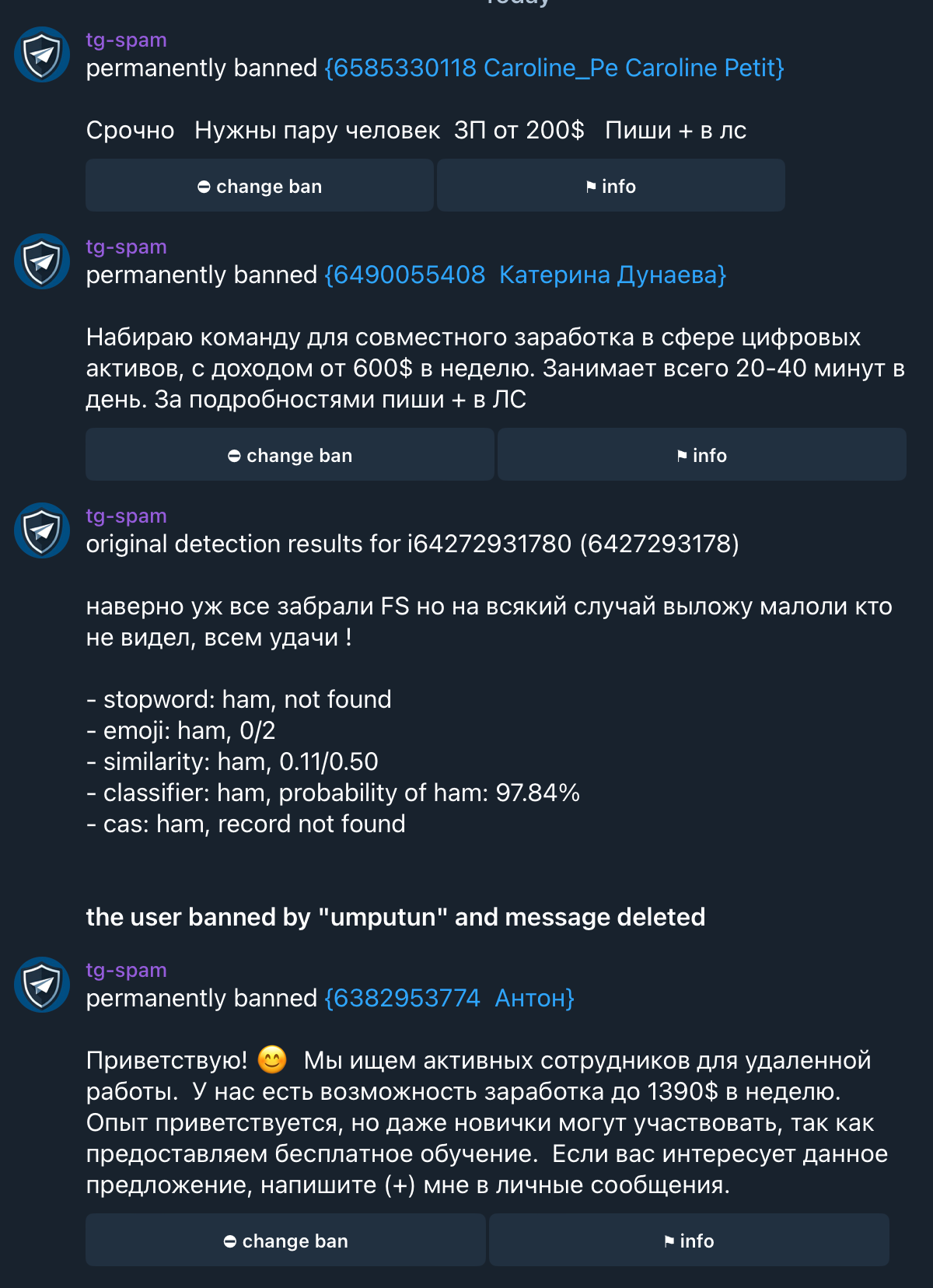Это все я назвал tg-spam, и эта штука реально работает, и работает очень достойно. Главная проблема таких систем — это ложные срабатывания, но их у меня было совсем немного. Конечно, иногда спам не определялся, но это была редкость, когда появлялся совсем новый вид спама. Админы на это реагировали быстро, добавляли его в выборку, и после этого все подобные сообщения определялись как спам.