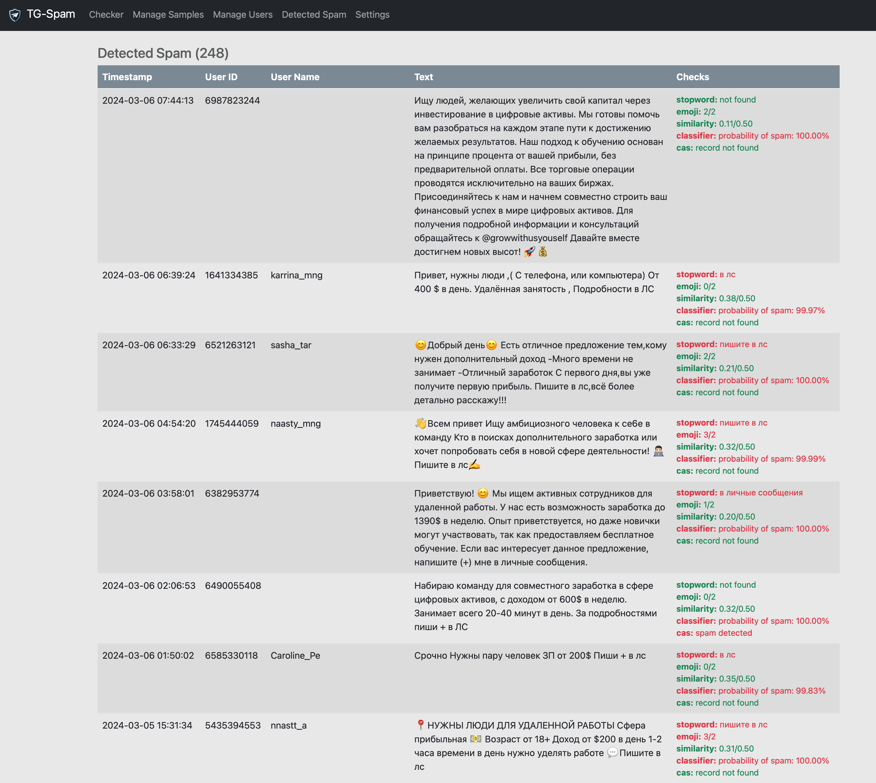 Это все я назвал tg-spam, и эта штука реально работает, и работает очень достойно. Главная проблема таких систем — это ложные срабатывания, но их у меня было совсем немного. Конечно, иногда спам не определялся, но это была редкость, когда появлялся совсем новый вид спама. Админы на это реагировали быстро, добавляли его в выборку, и после этого все подобные сообщения определялись как спам.